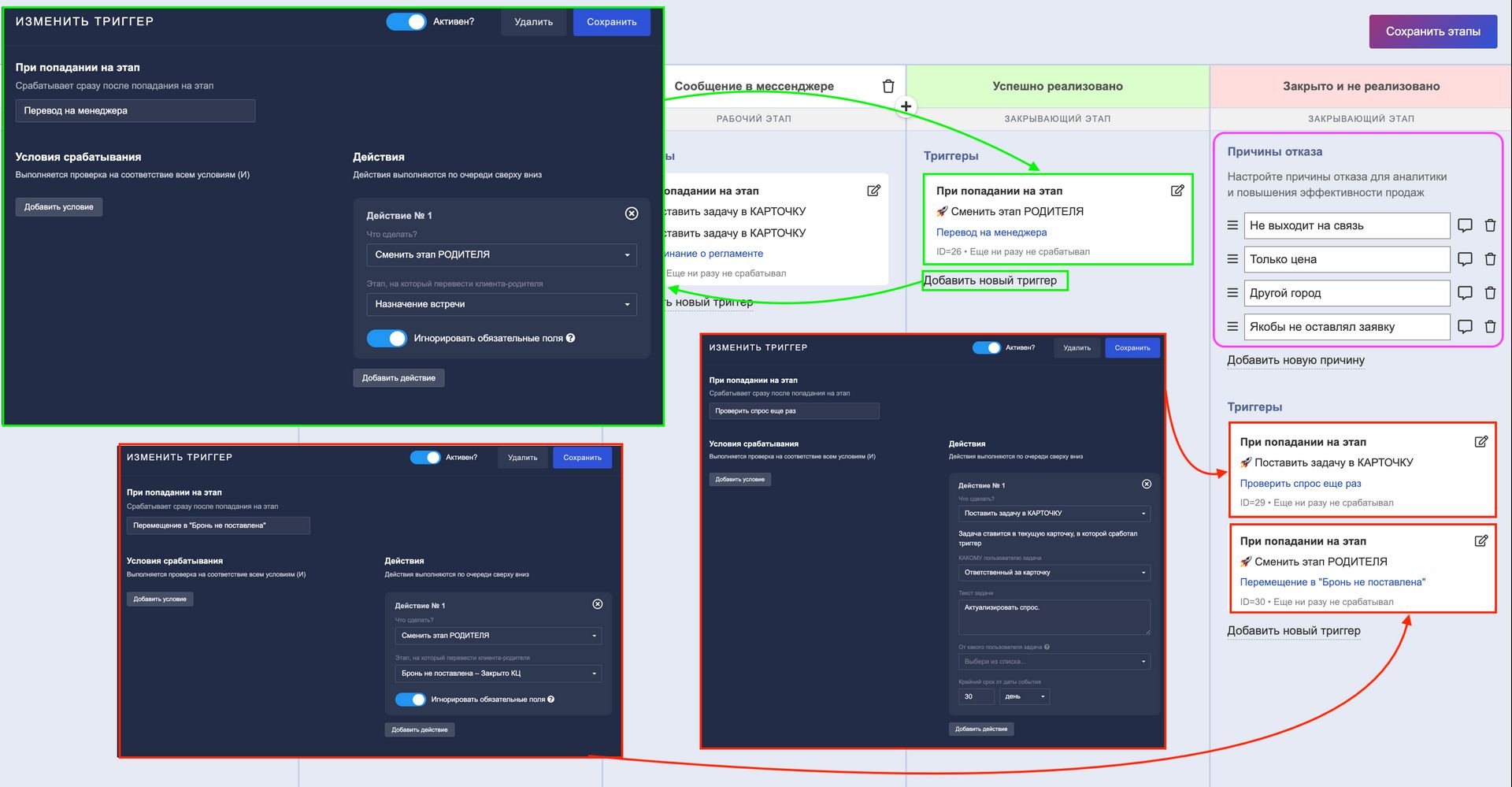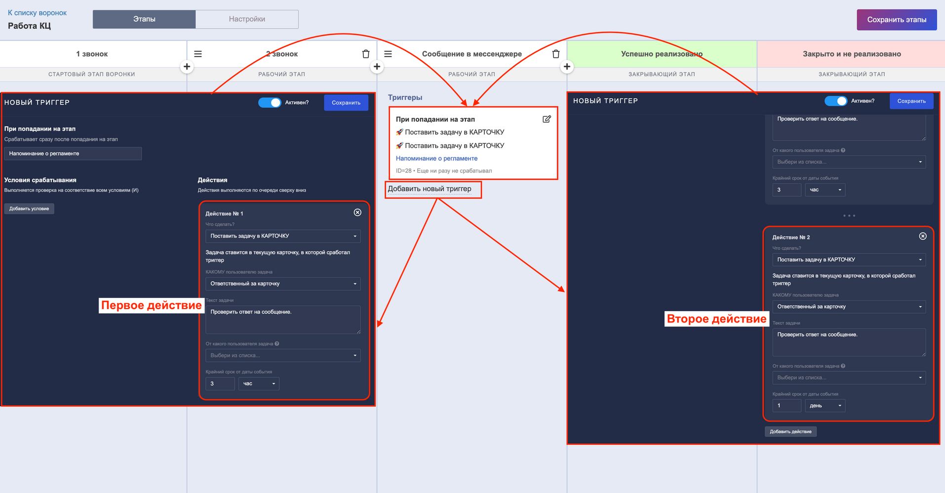 Система предоставляет полную свободу: вы можете добавлять неограниченное количество триггеров на каждый этап, а в рамках каждого триггера — неограниченное количество действий. Однако мы рекомендуем соблюдать разумный баланс.