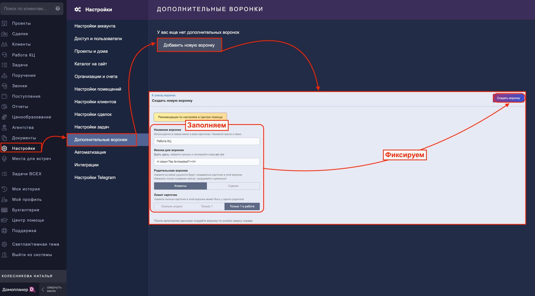 Перейдите в раздел НАСТРОЙКИ — Дополнительные воронки — нажмите «Добавить новую воронку». В открывшемся окне заполните необходимые поля:
