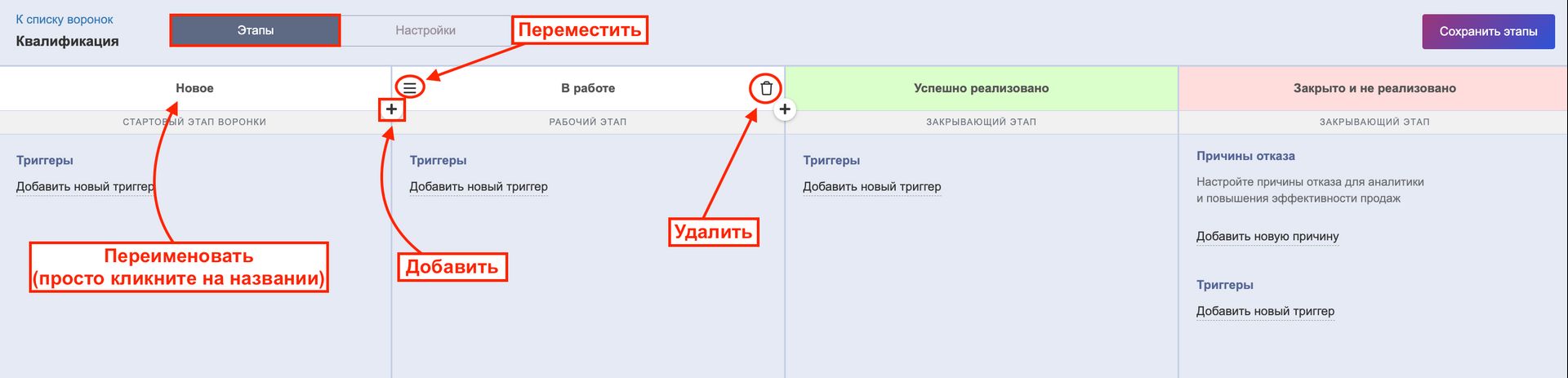 Выберите воронку, нажмите на кнопку "открыть" — окно редактирования воронки откроется на вкладке "Этапы". Здесь вам необходимо: