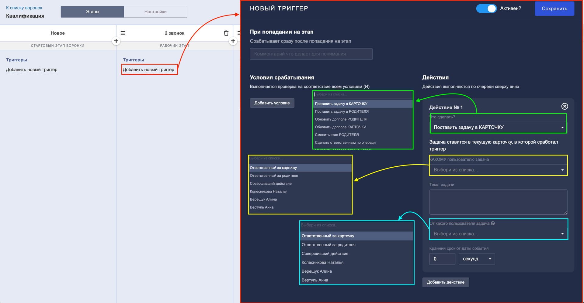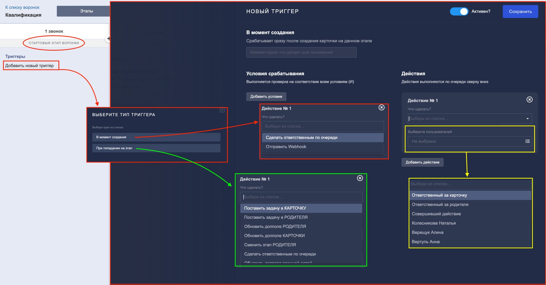 ИСКЛЮЧЕНИЕМ является стартовый этап — для него вам еще необходимо указать момент срабатывания триггера. Вы можете выбрать из двух — в момент создания карточки (количество действий ограничено), либо при попадании на этап (если карточка может вернуться с другого этапа на стартовый этап):