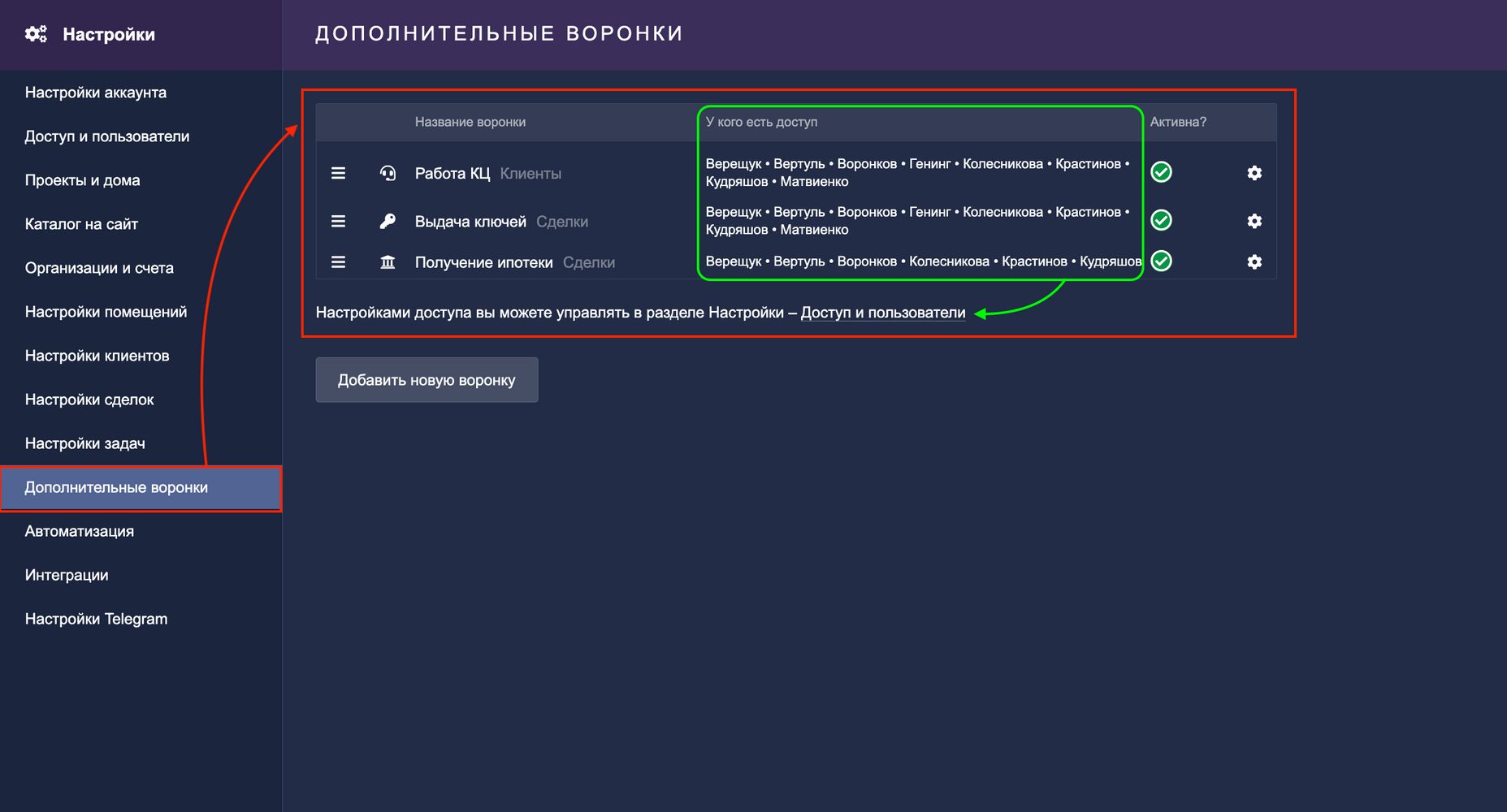После создания дополнительной воронки важно настроить права доступа для сотрудников.