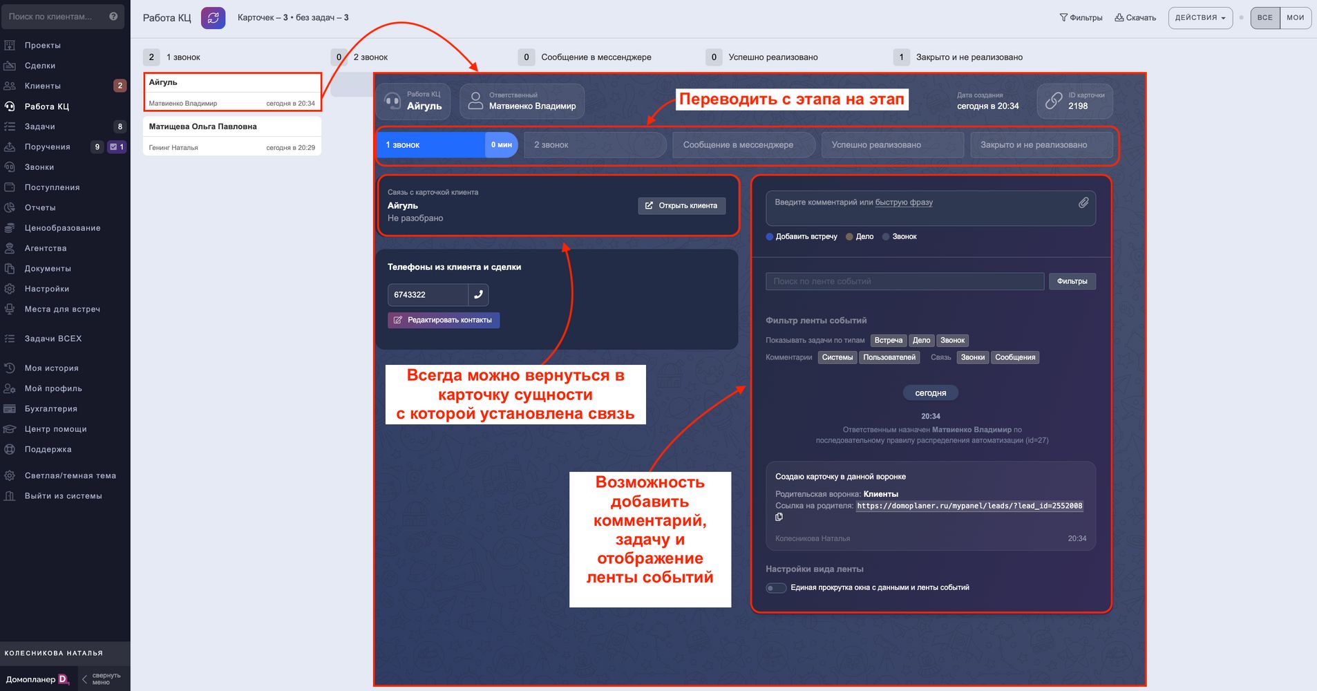 — Если клиент отвечает, то сотрудник переводит карточку в этап "Успешно реализовано", а карточка клиента в основной воронке автоматически двигается на следующий этап для дальнейшей работы.