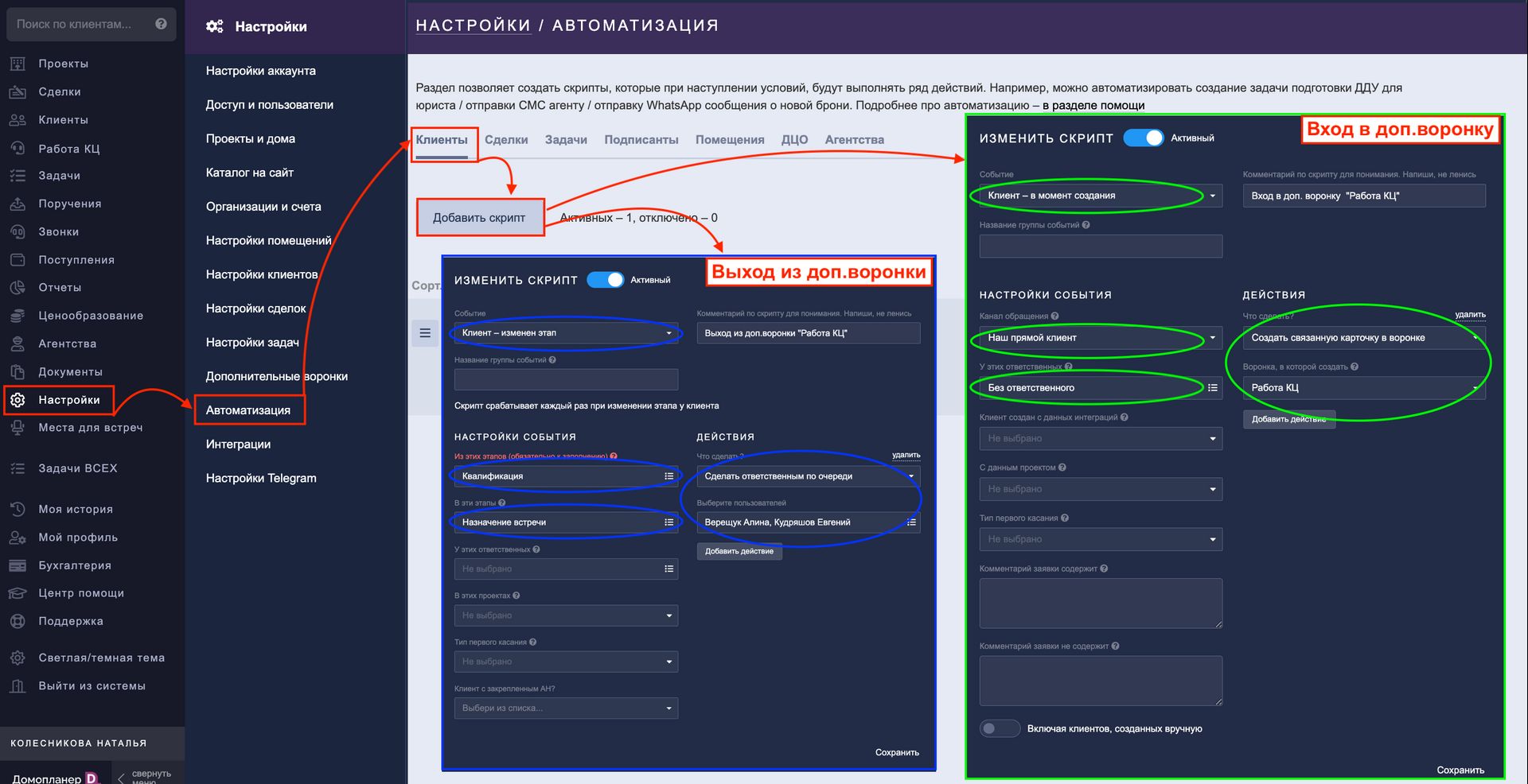 Чтобы автоматизировать вход и выход из воронки настроим скрипты автоматизации: