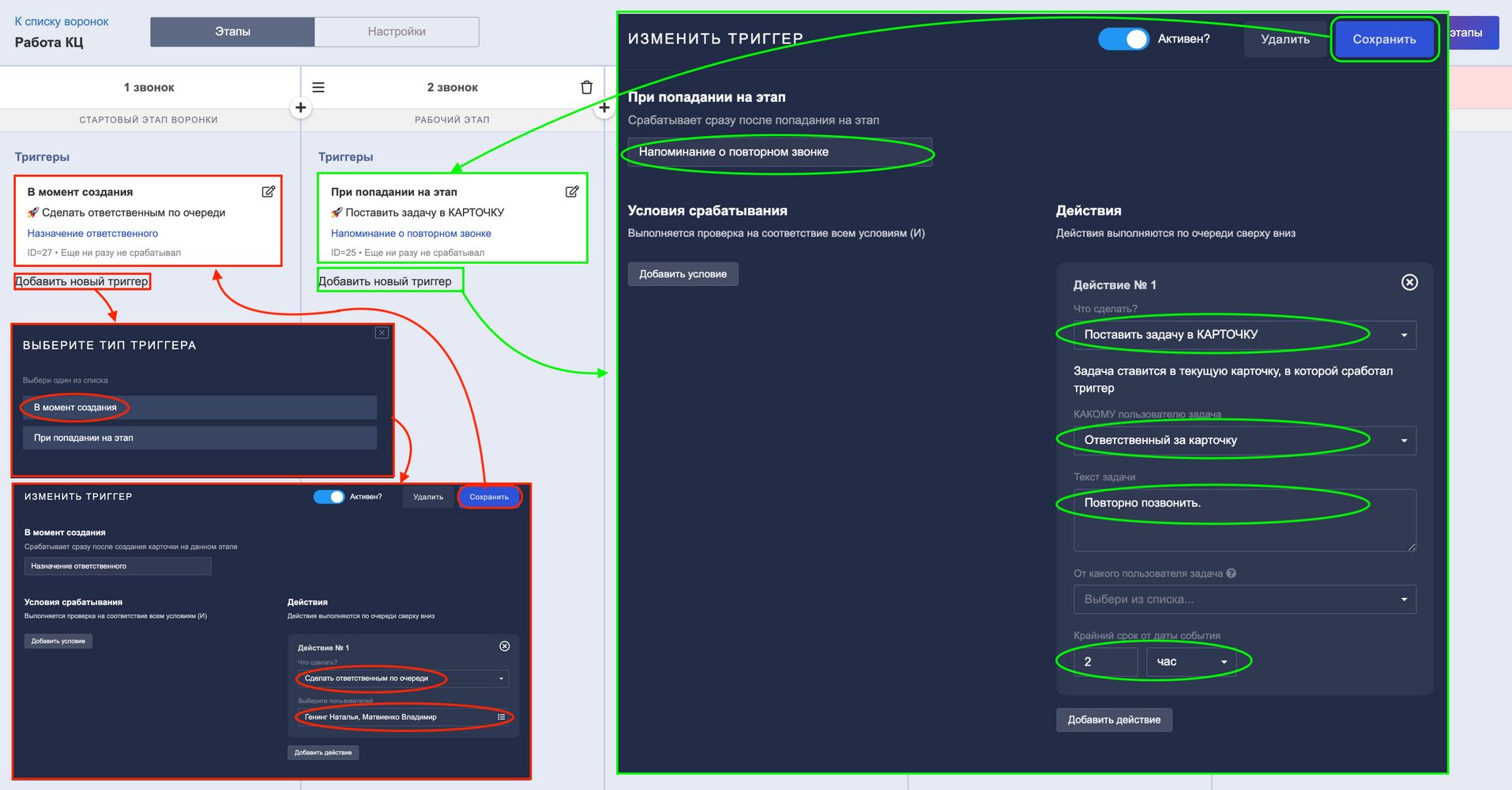 — Триггеры работают внутри дополнительной воронки (например, в воронке "Работа КЦ").