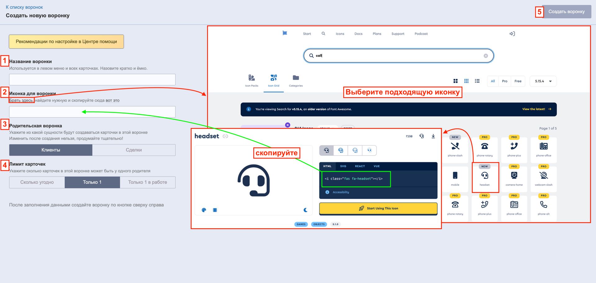 2. Иконка. Выберите значок для отображения воронки в главном меню, чтобы её можно было быстро найти. Нажмите на "брать здесь", выберите желаемую иконку, скопируйте код и вставьте в поле "Иконка".