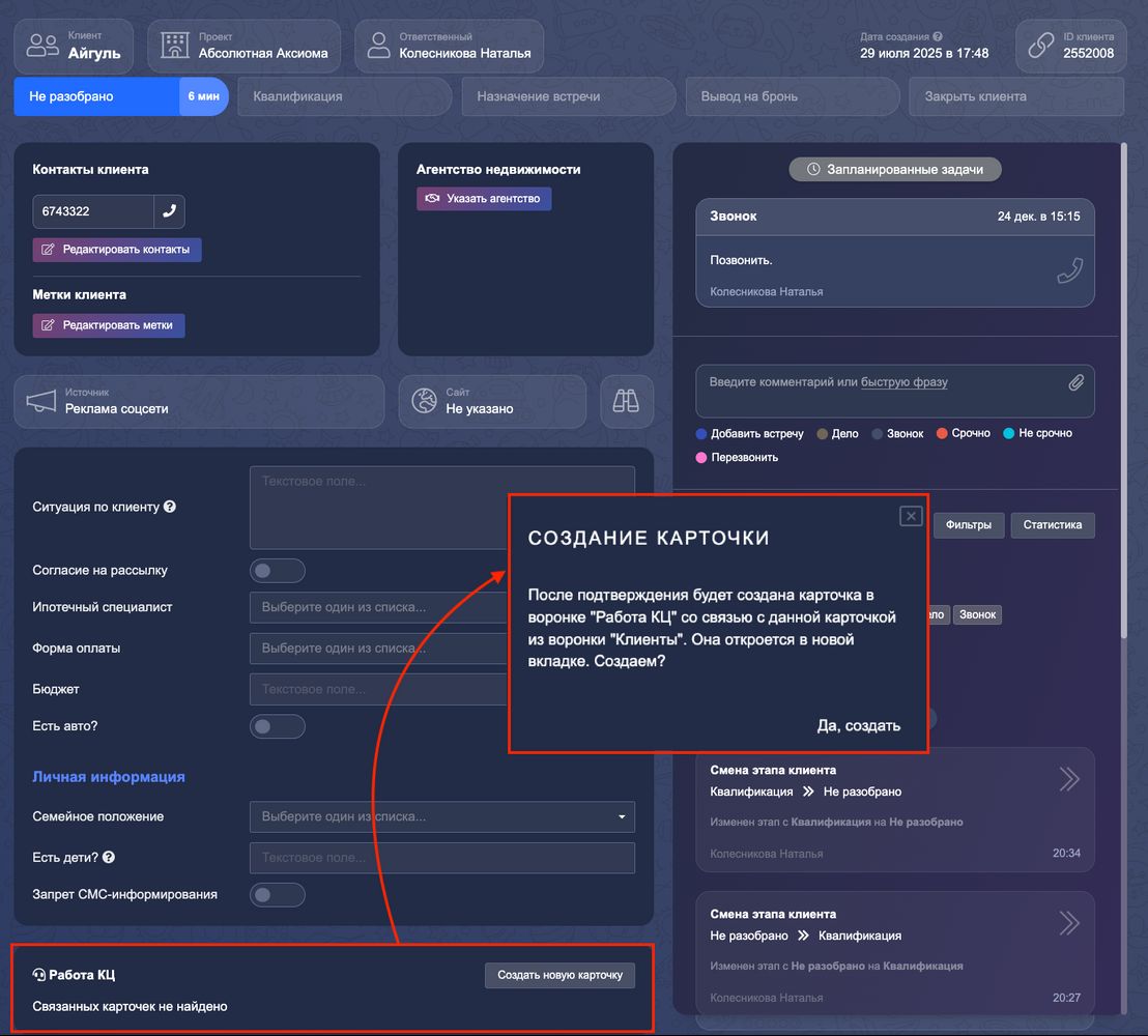 Структура карточки дополнительной воронки очень похожа на карточку клиента/сделки. В ней собраны все инструменты, необходимые для полноценной работы с процессом: