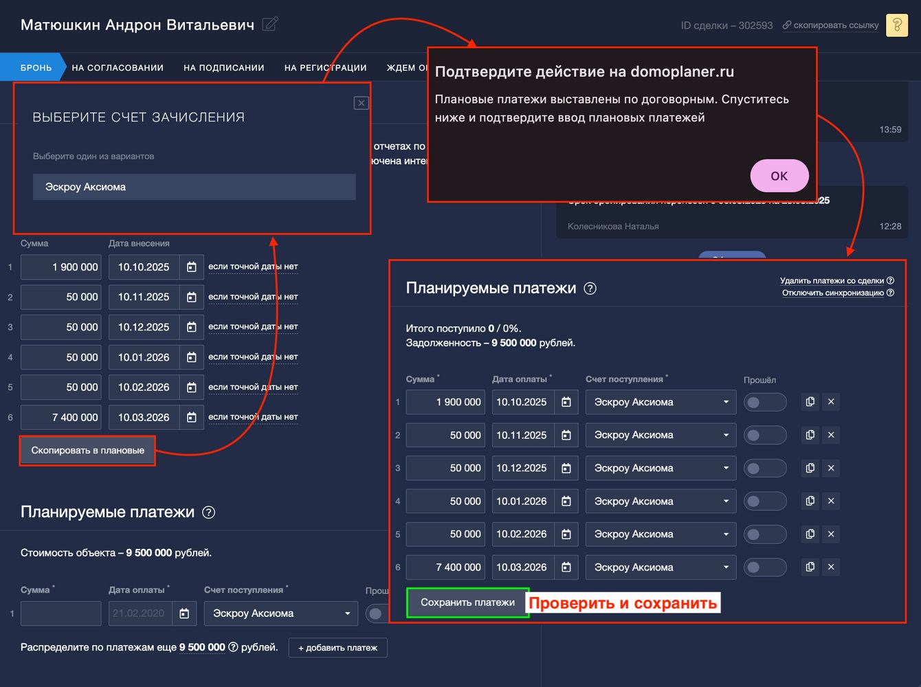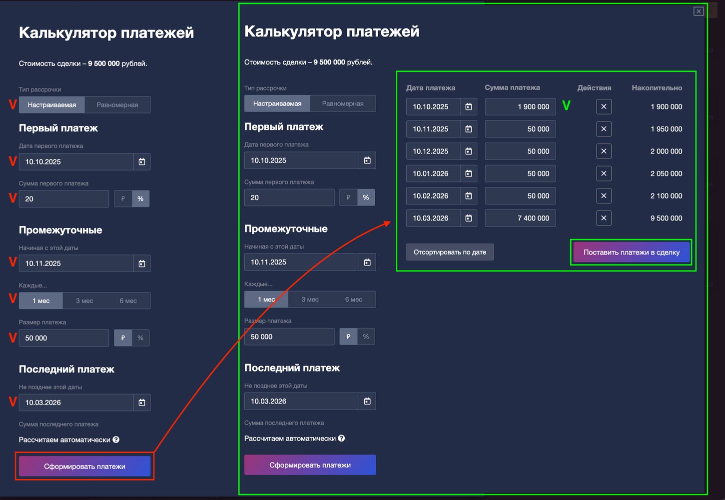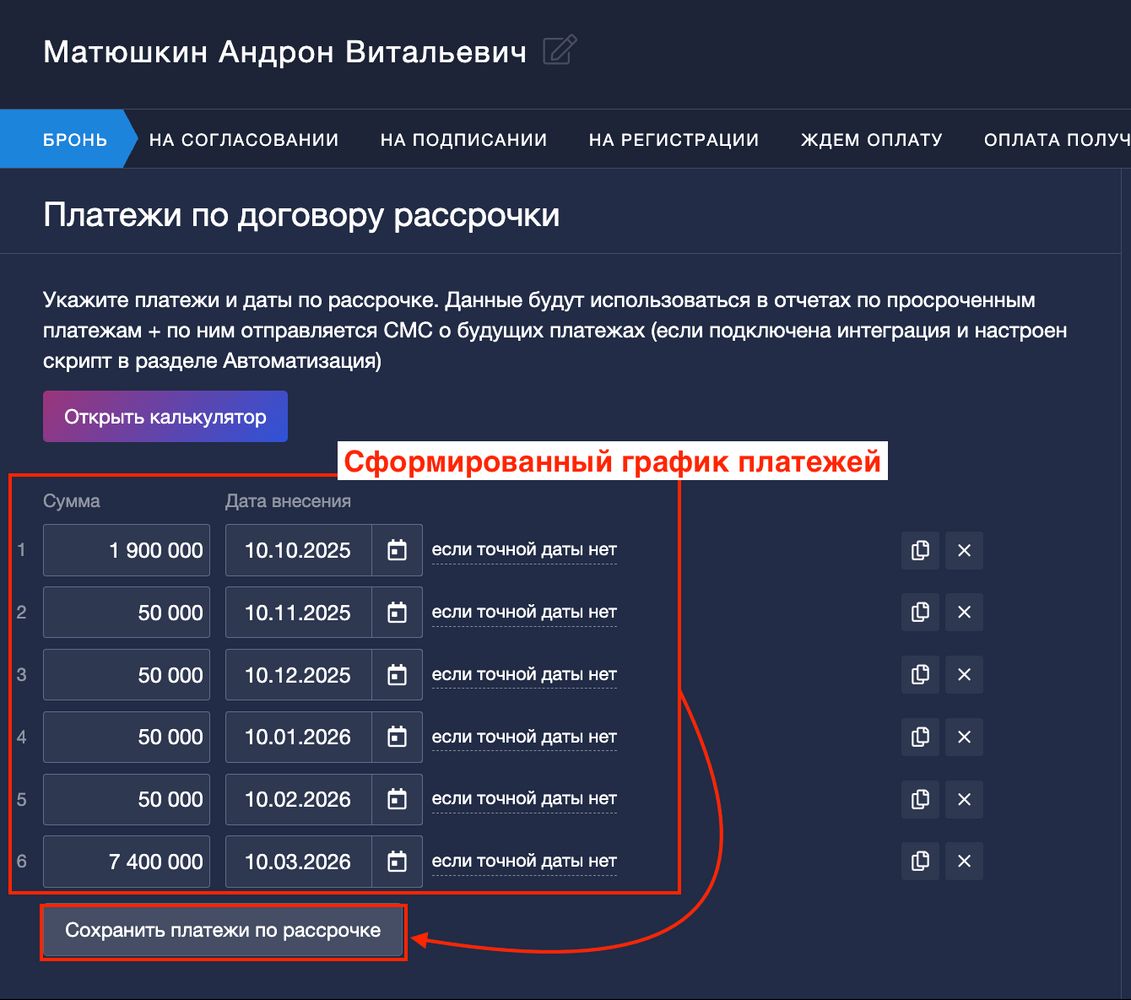 Система рассчитала размер первого платежа и остаток распределила равными платежами с периодом в месяц до указанной даты последнего платежа. График рассрочки готов! если вы проверили и со всем согласны, то смело нажимайте кнопку "Поставить платежи в сделку" и график отобразится в карточке сделки: