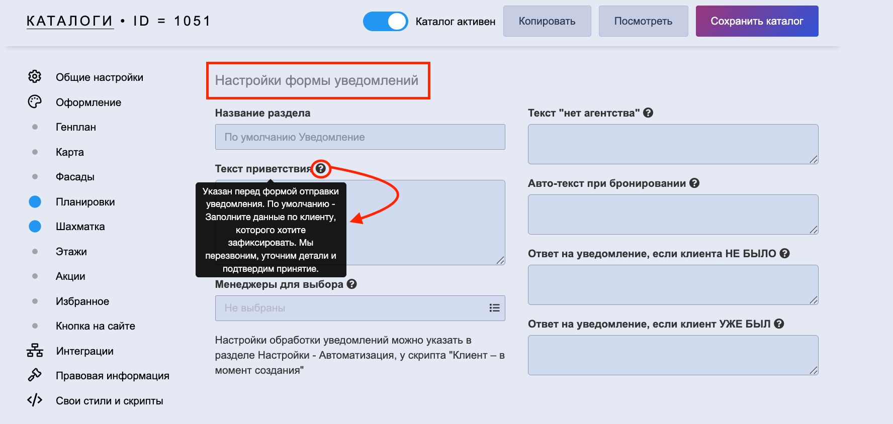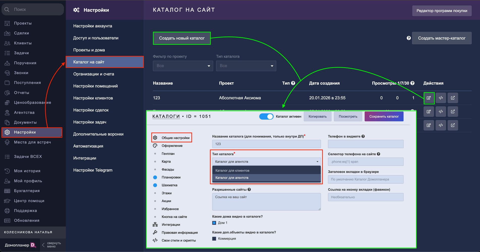 1. Перейдите в НАСТРОЙКИ — Каталог на сайт — Общие настройки — графа "Тип каталога" — выберите значение "Каталог для агентств":