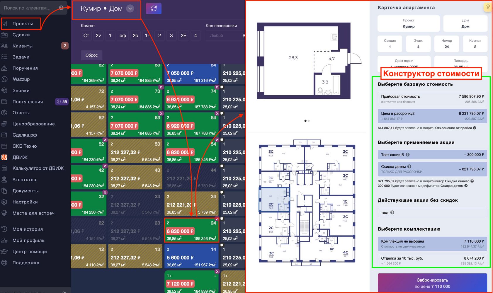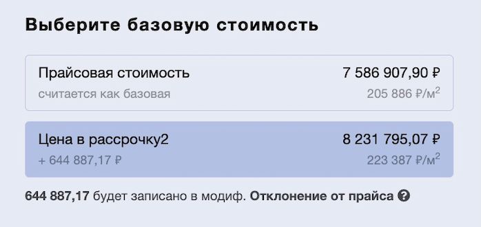 Но если у вас есть изменение цены в зависимости от типа оплаты, от выбора ипотечных программ или любых других условий, то это тоже можно учитывать при расчете.