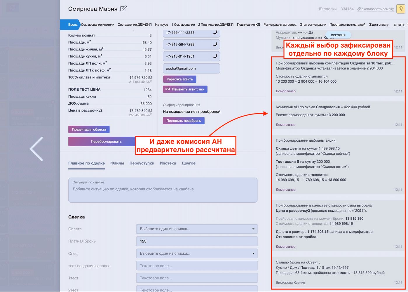 Для полной прозрачности система ведет детальный протокол всех расчетов. Каждое изменение фиксируется в карточке сделки — в модификаторах и Ленте событий. Вы всегда можете увидеть из чего складывается итоговая стоимость: