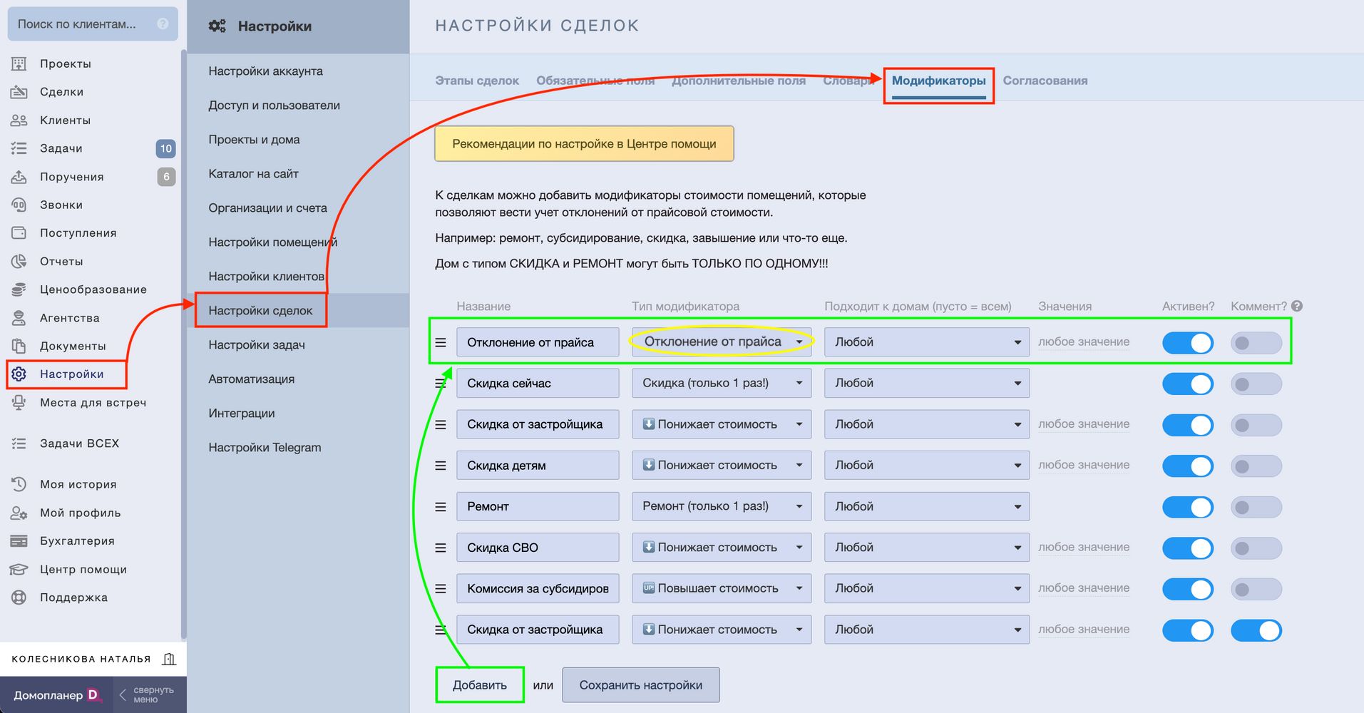 Для этого пройдите в НАСТРОЙКИ — Настройки сделок — Модификаторы — Добавить: