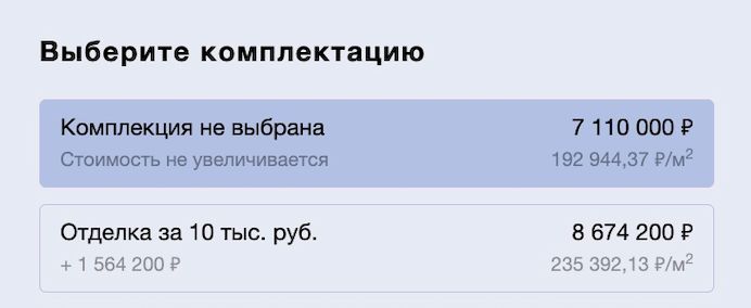 Стоимость индивидуально для каждой комплектации отображается конструкторе согласно настройкам. Остается только выбрать вариант (или не выбирать = "Комплектация не выбрана"), который предпочитает покупатель, и его стоимость автоматически отобразится на итоговой стоимости помещения.