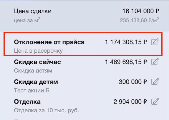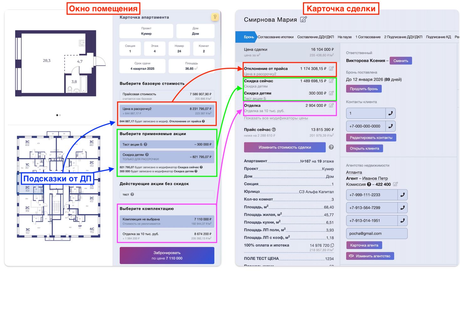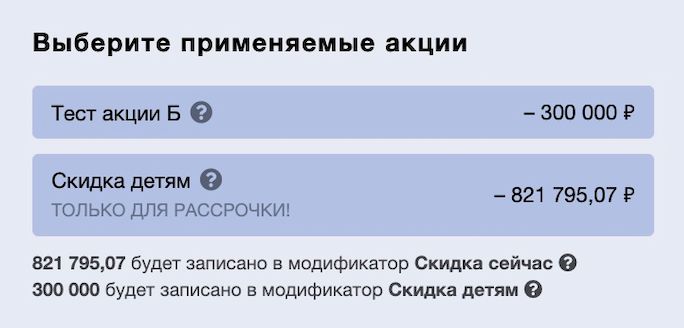 Поскольку рассматриваемые акции влияют на стоимость, их необходимо связать с модификаторами цены. Это обеспечит корректное отображение всех изменений в карточке сделки.