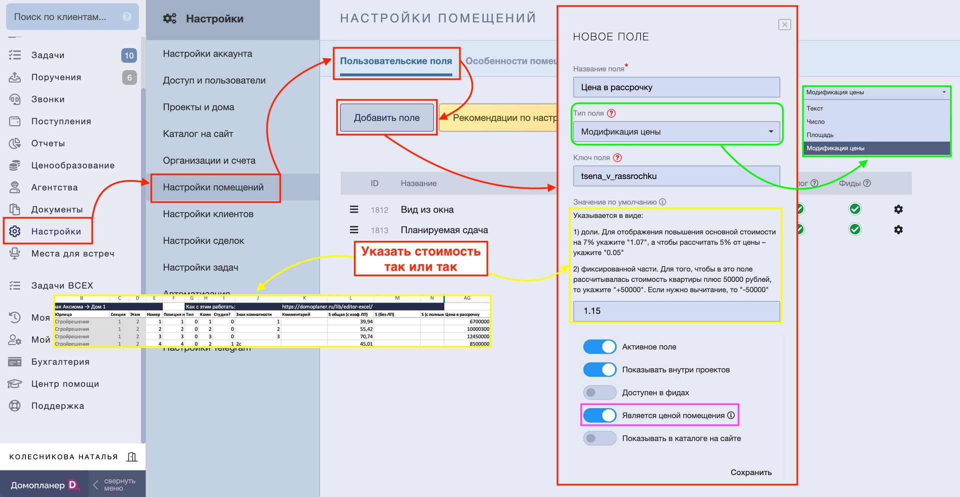 5. Включить переключатели — "Активное поле", "Показывать внутри проектов", "Является ценой помещения".