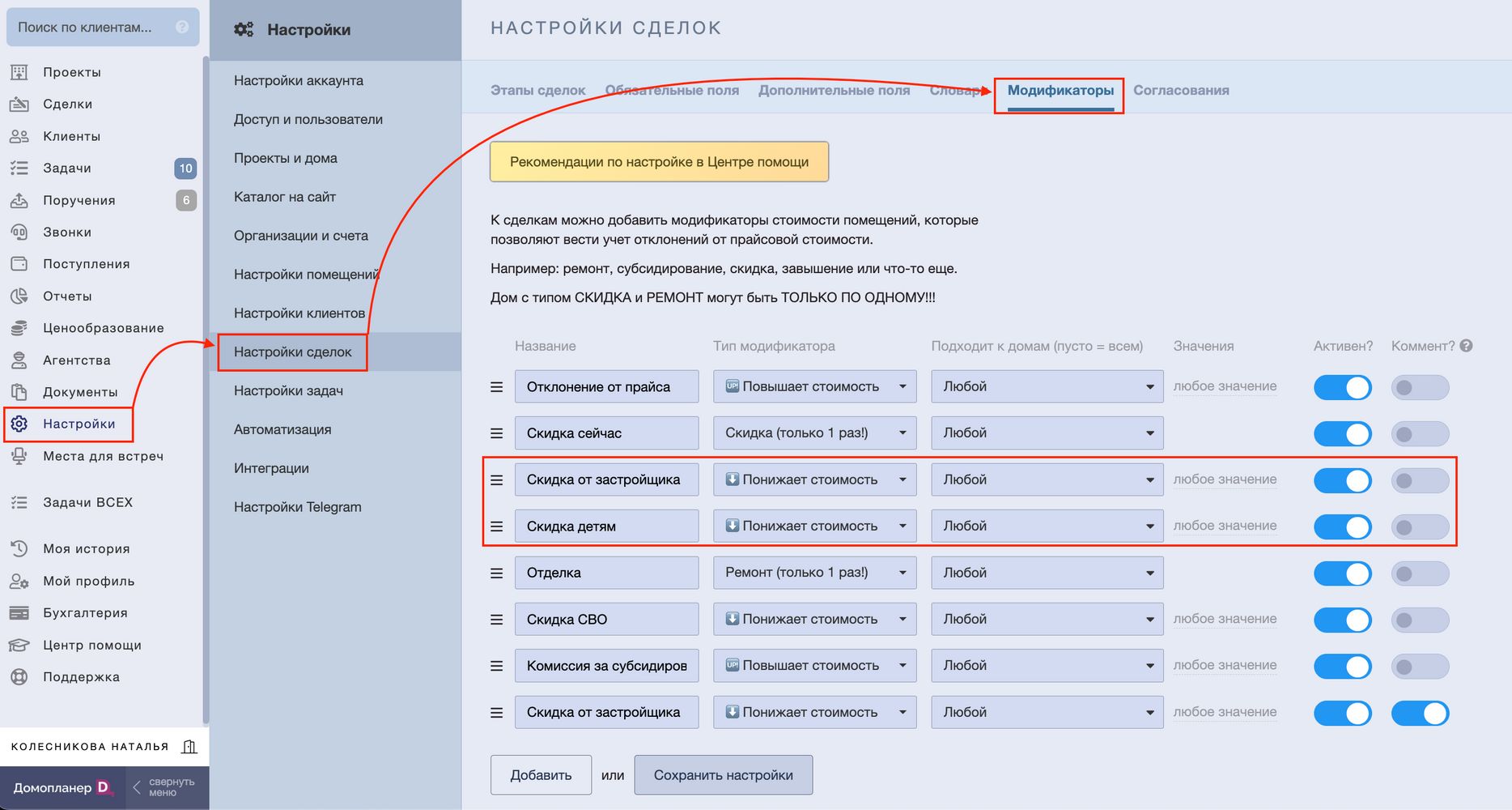 СОВЕТ! Для удобства восприятия, лучше сделать так, чтобы порядок модификаторов в карточке сделки совпадал с очередностью в конструкторе. Напомним, как это можно седлать: пройдите в НАСТРОЙКИ — Настройки сделок — Модификаторы — зажмите иконку с тремя горизонтальными линиями и перетащите элемент на нужную позицию.