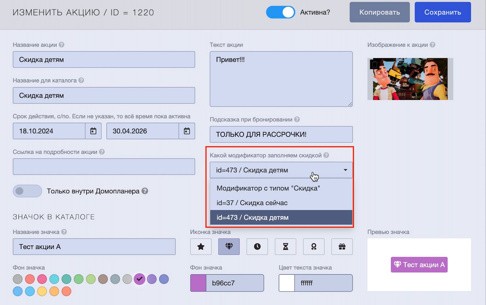 Как это сделать? При создании акции просто укажите в соответствующем поле к какому модификатору должна быть применена скидка: