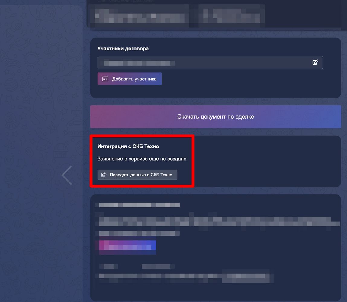 Внутри сделки, для которой вы хотите создать заявление на регистрацию в сервисе СКБ Техно, найдите блок "Интеграция с СКБ Техно" и кликните на кнопку "Передать данные в СКБ Техно".