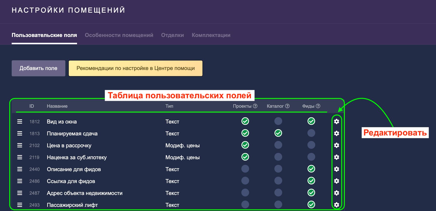 Здесь расположена таблица, которая выполняет роль контроля и наглядности: вы видите полный перечень всех пользовательских полей и текущее состояние каждого поля — с названиями, типами, ID, а также активно ли поле и если активно, то где именно: в проектах, каталоге или фидах:
