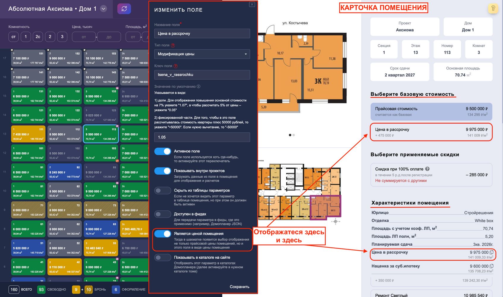 9. Является ценой помещения — этот переключатель появляется только при выборе типа поля "Модификация цены" и "Число". При включенном состоянии отображается как один из вариантов базовых цен в конструкторе стоимости в карточке помещения (+ и в "Характеристиках помещения"):