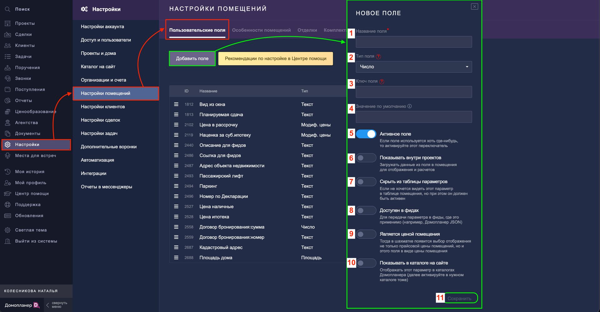 После сохранения ваше пользовательское поле будет отображаться в НАСТРОЙКАХ — Настройки помещений — Пользовательские поля.