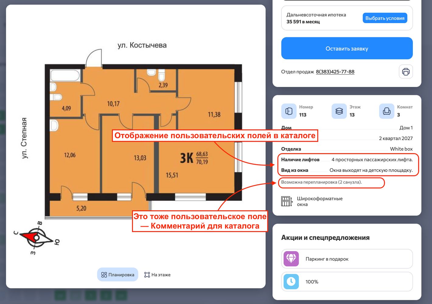 И в каталоге в карточке помещения появится дополнительная информация о варианте. Такое поле — комментарий для каталога — может быть только одно.