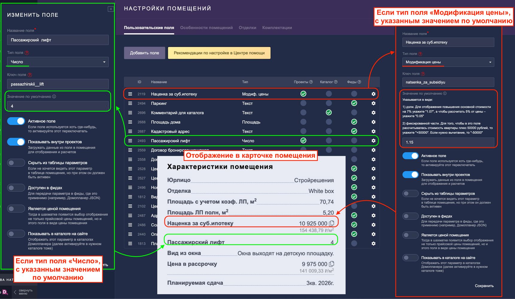 Иногда стандартных решений недостаточно для удовлетворения всех пожеланий и требований застройщиков. В таких случаях можно добавить свои дополнительные параметры — Пользовательские поля для помещений.