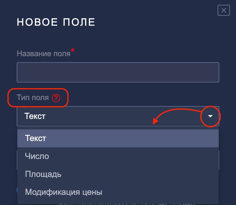 2. Тип поля — существует несколько типов поля, вы можете выбрать подходящий в выпадающем списке: