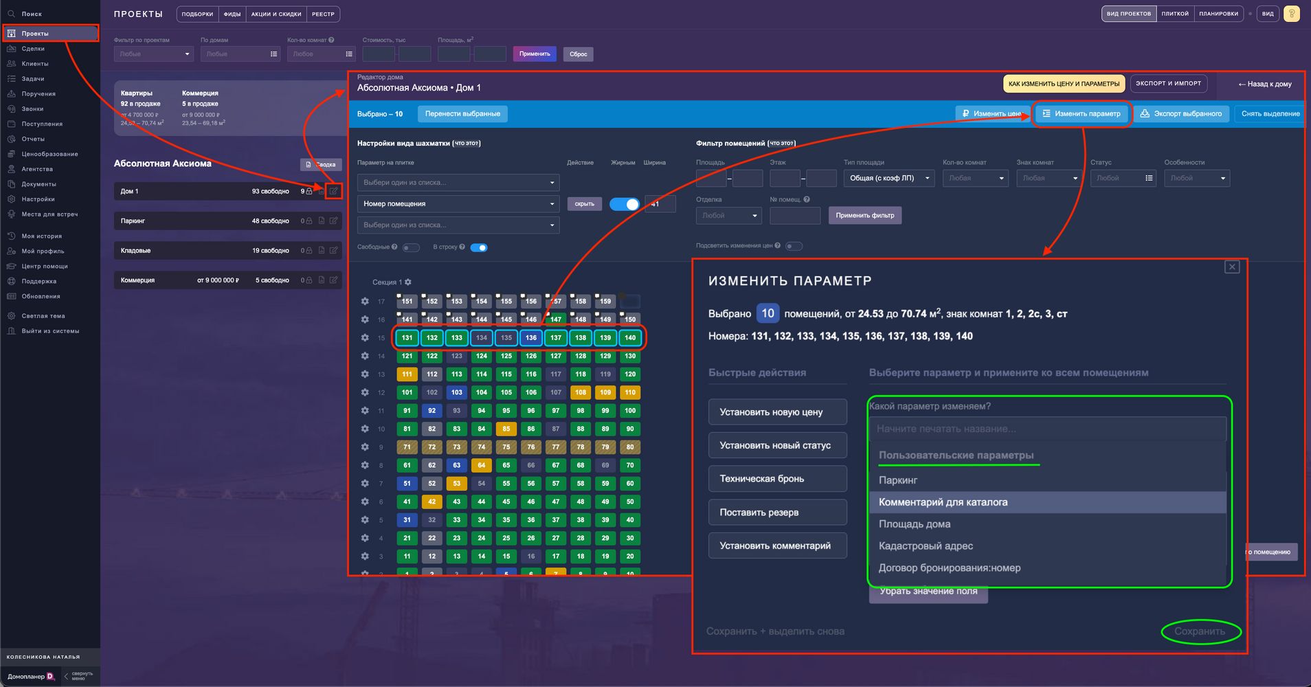 Пройдите в ПРОЕКТЫ — выберите нужный дом — Редактор дома — на шахматке выделите те помещения, для которых устанавливаете значение пользовательского поля — нажмите на кнопку "Изменить параметры" — в выпадающем списке найдите нужное поле — введите значение и нажмите кнопку сохранить: