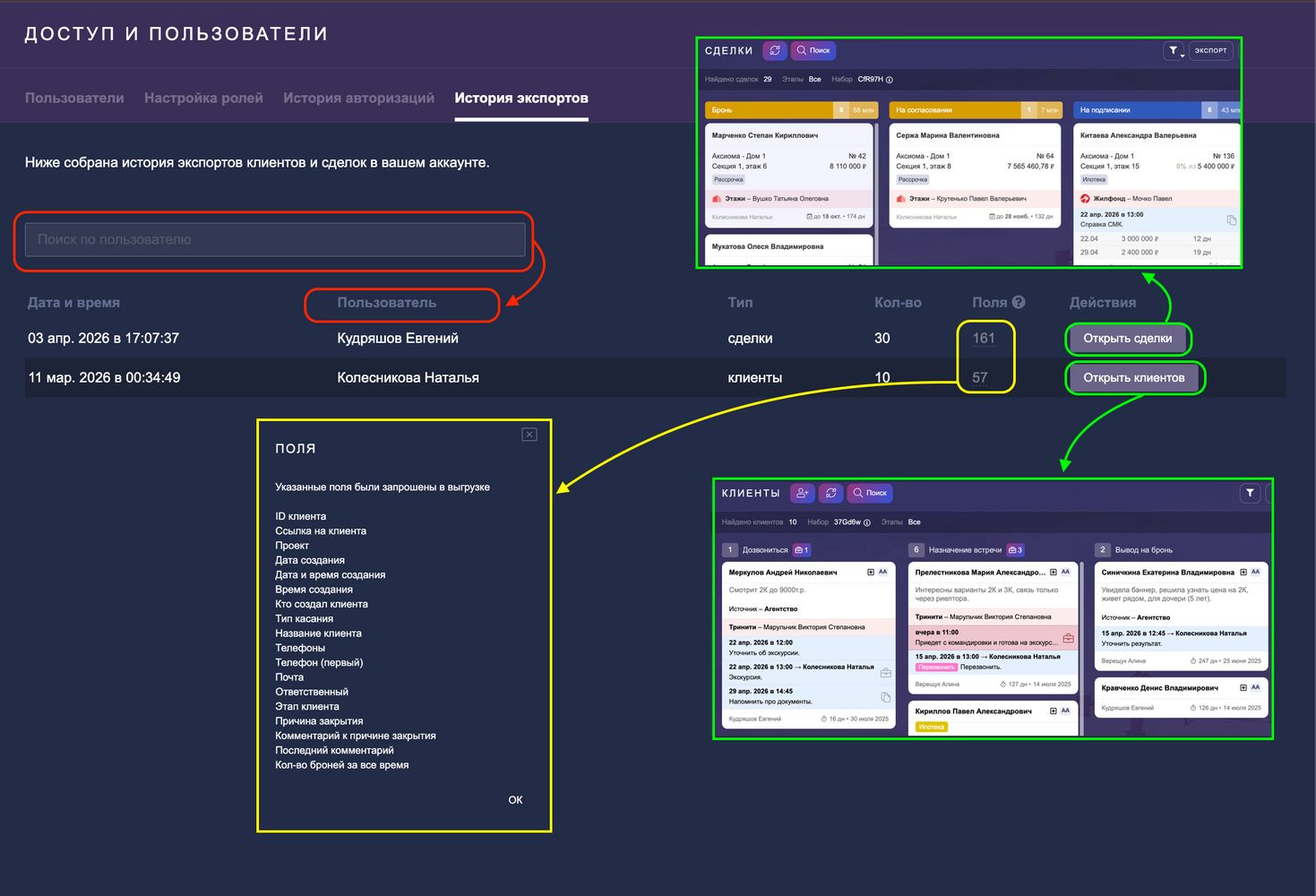 Вкладка "История экспортов" — отображает историю всех эскпортов, осуществленных с канбанов клиентов и сделок: