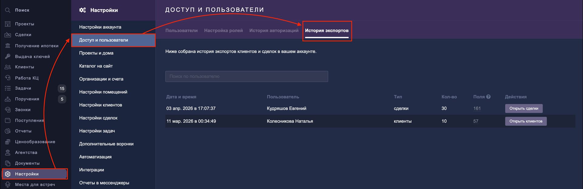 Доступ к Истории экспортов предоставлен исключительно пользователям, имеющим права на просмотр раздела НАСТРОЙКИ.