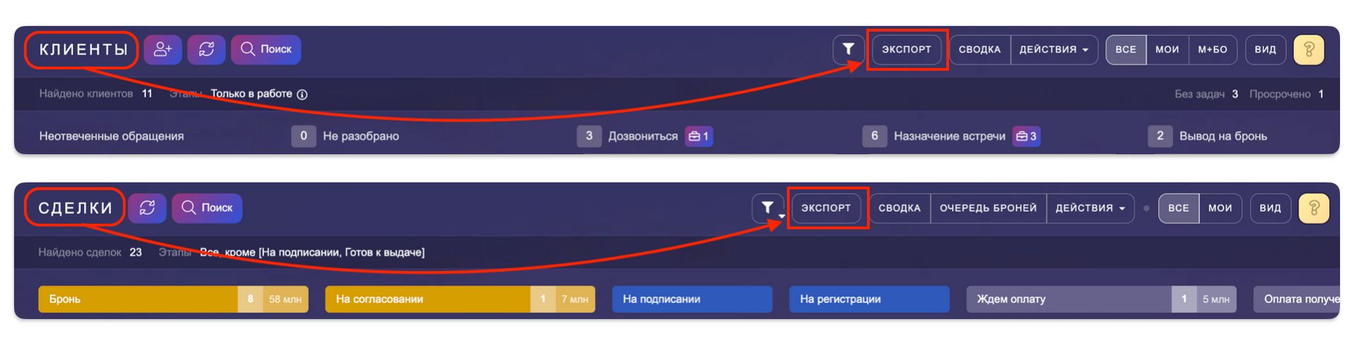 — Действия. Доступно действие "Открыть клиентов/сделки", которое открывает в новой вкладке полный перечень клиентов или сделок, соответствующих критериям отбора на момент экспорта.