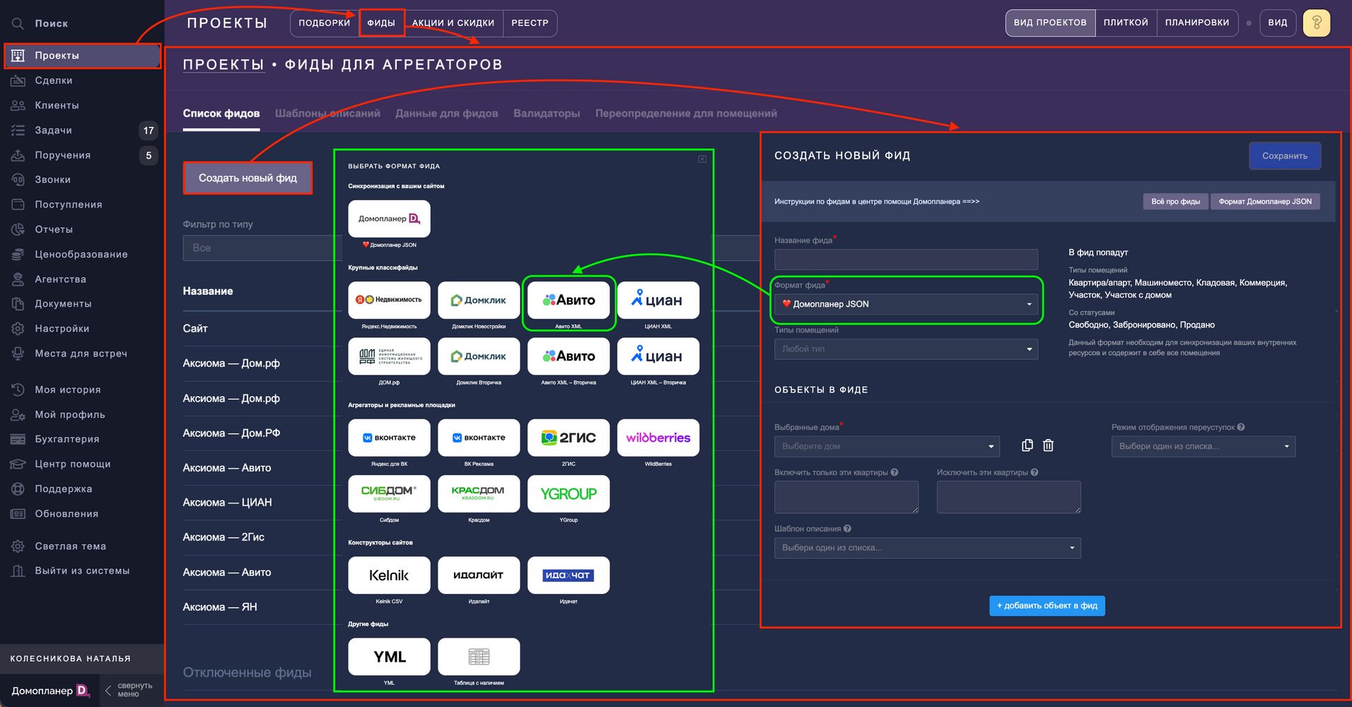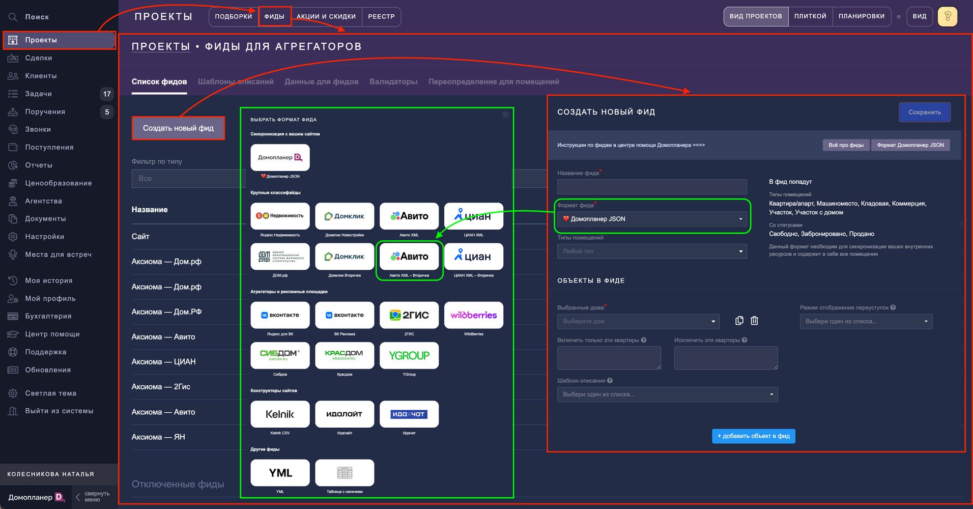 Для создания перейдите в раздел ПРОЕКТЫ — Фиды — Список фидов — нажмите кнопку "Создать фид" и и выберите формат фида "Авито XML – Вторичка":
