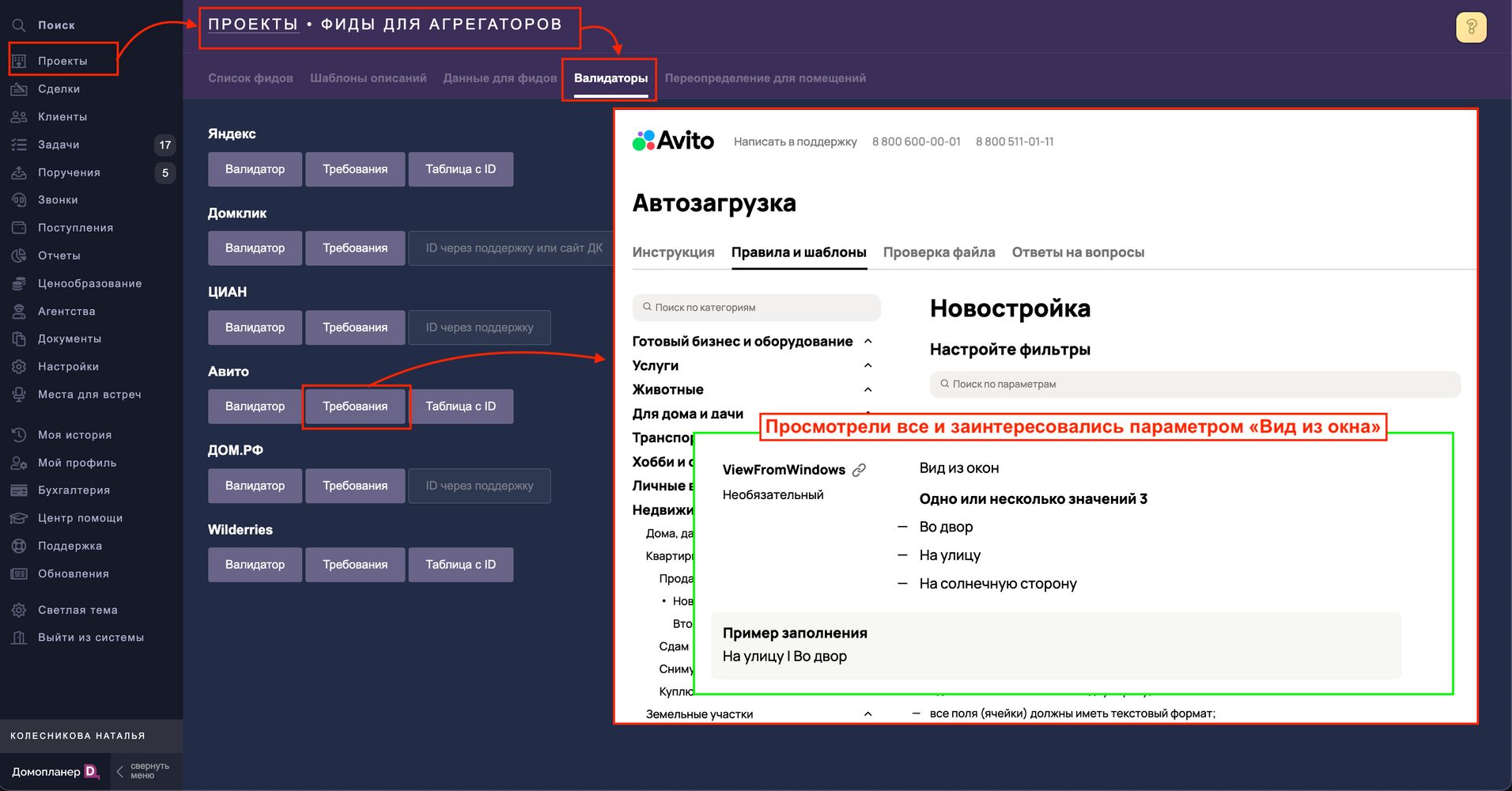 В настройке фида для Авито все значительно проще. Достаточно один раз заполнить реестр — и для каждого помещения автоматически подгрузятся свои индивидуальные характеристики. Это более простой и гибкий вариант, когда данные по квартирам различаются.