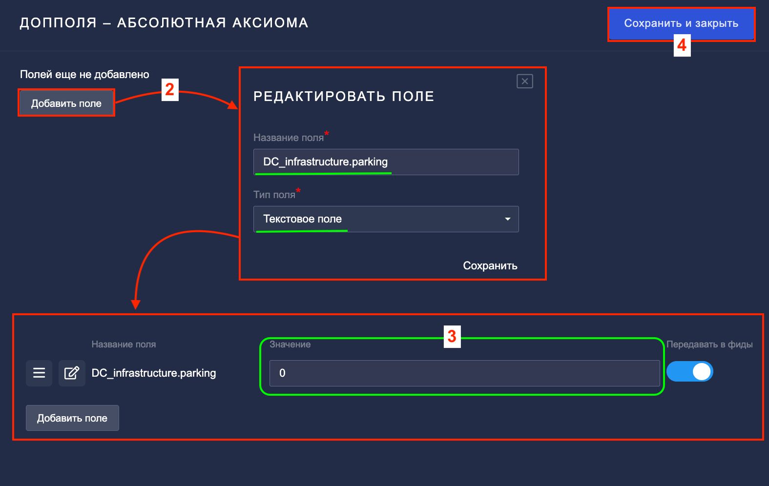 2. Создайте новое дополнительное поле с параметрами:— Название: DC_infrastructure.parking (строго по этому шаблону)— Тип: Текстовое: