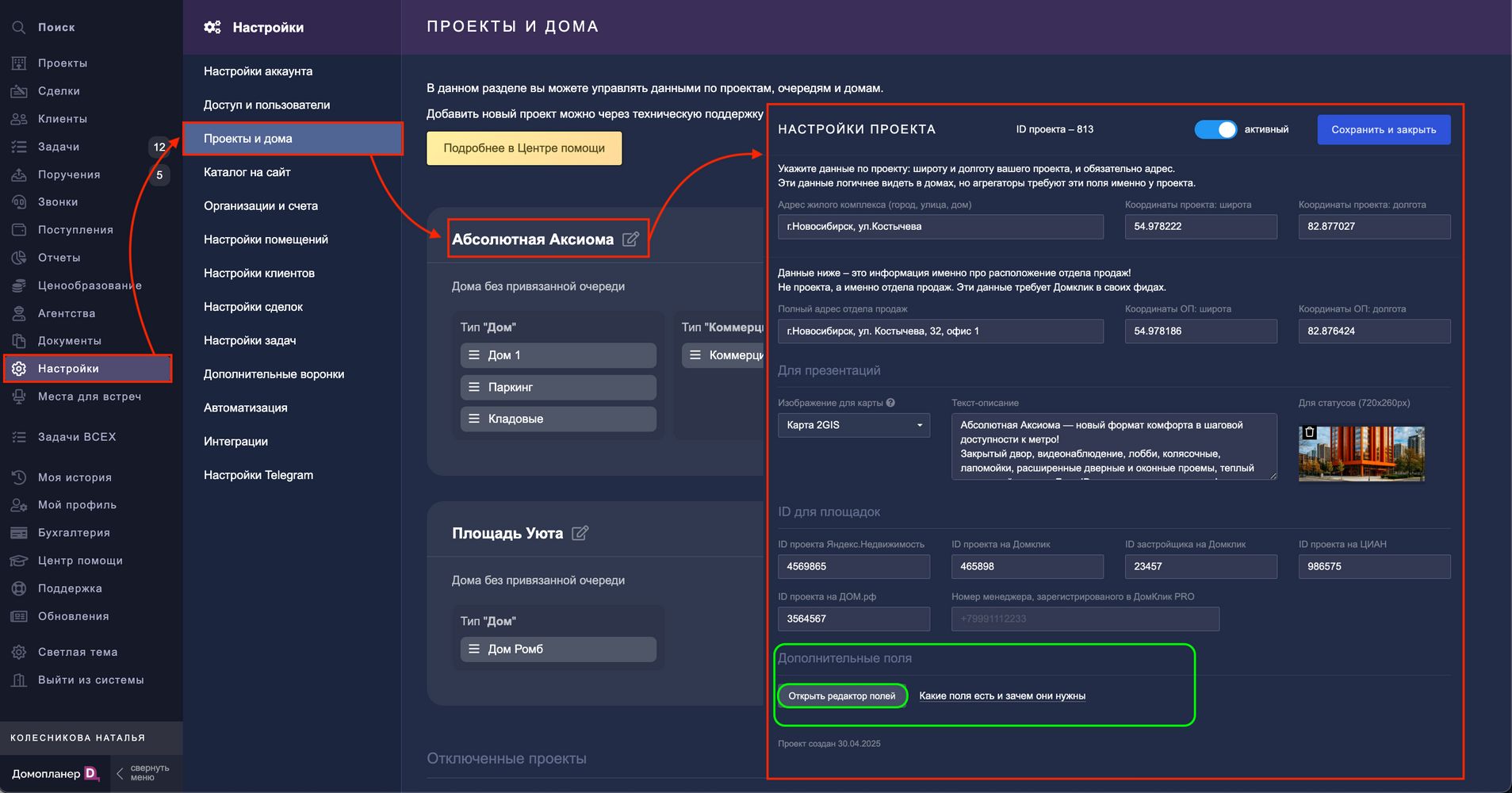Перейдите в раздел НАСТРОЙКИ — Проекты и дома — Настройки проекта — Дополнительные поля — нажмите кнопку "Открыть редактор полей":