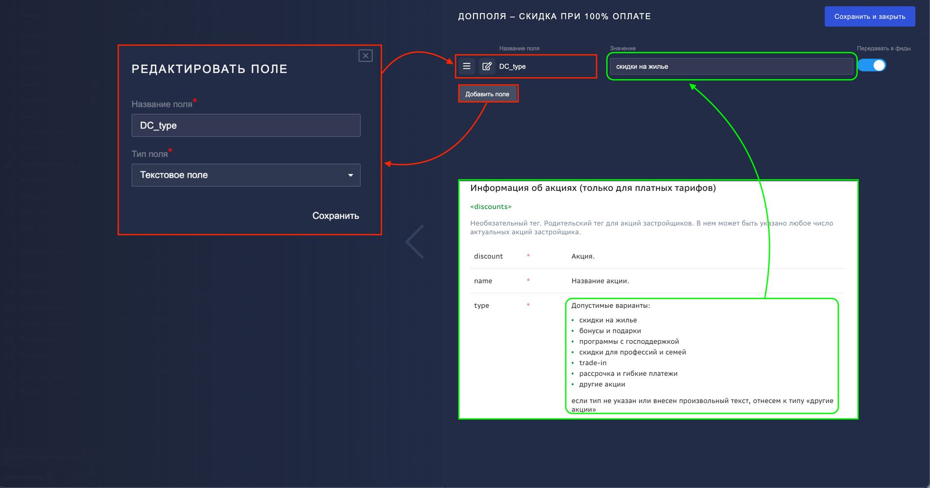После создания поля в этом же окне укажите нужное значение — тип акции из списка требований Домклика. Например, для акции с общей скидки для всех, передайте в поле значения "скидки на жилье".