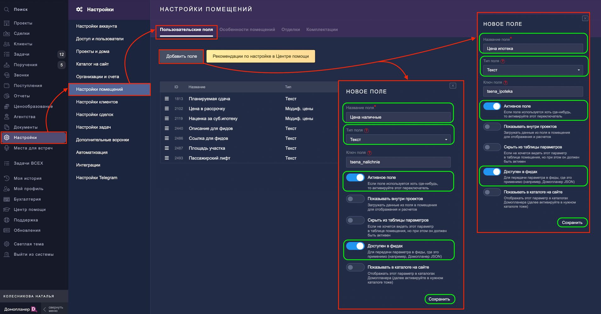 Где взять ID поля? Он отображается в списке дополнительных полей в разделе НАСТРОЙКИ — Настройки помещений — Пользовательские поля.