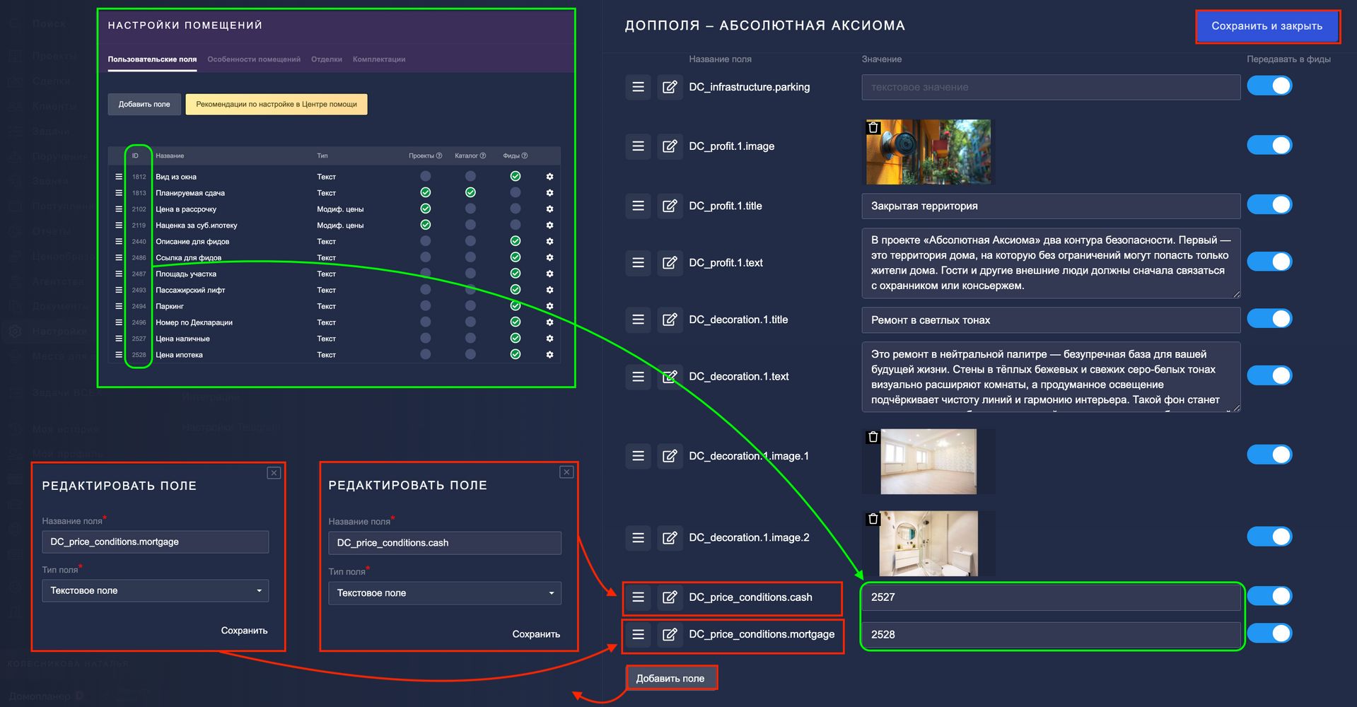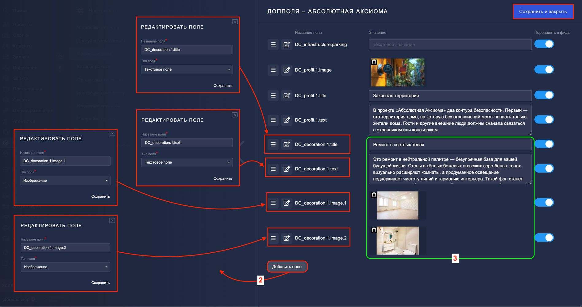 2. Нажмите на кнопку "Добавить поле" и для каждой отделки создайте три связанных дополнительных поля для проектов:
