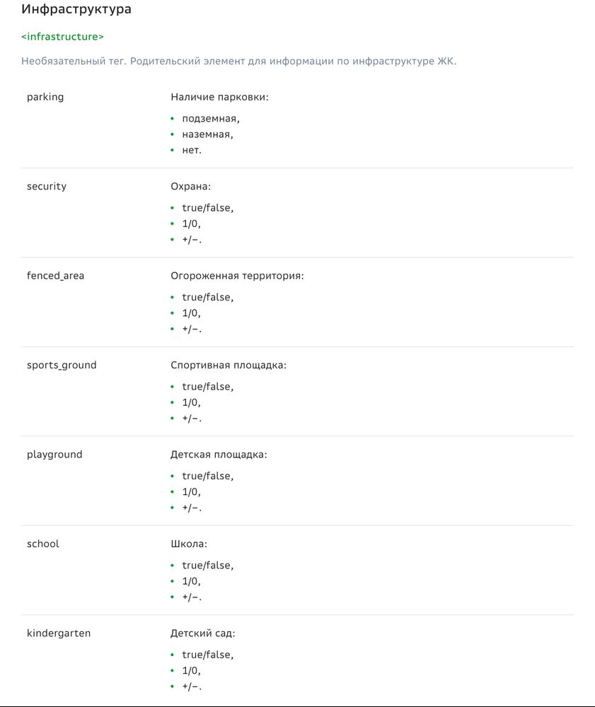 В фиде Домклика для каждого проекта предусмотрен блок с информацией об инфраструктуре. Давайте посмотрим, какие параметры можно передавать и какие значения для них допустимы согласно требованиям площадки: