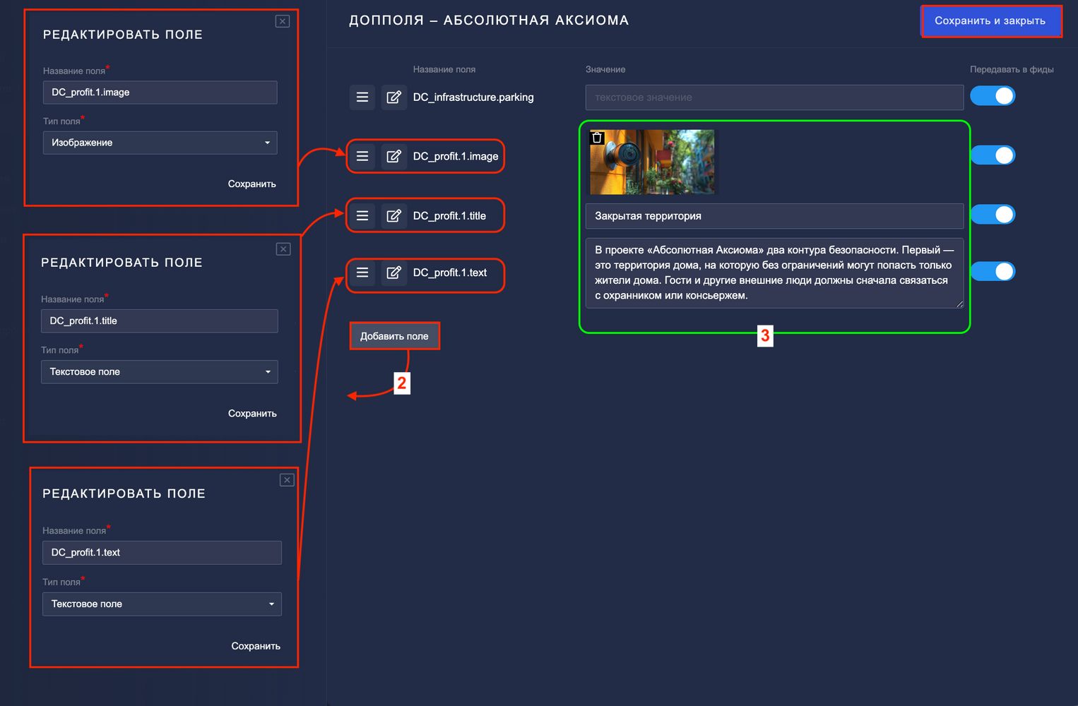 Цифра в названии поля указывает номер карточки (от 1 до 10). Для второй фишки поля будут называться `DC_profit.2.image`, `DC_profit.2.title`, `DC_profit.2.text` и так далее.