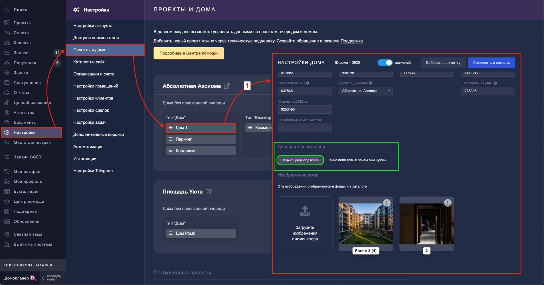 1. Перейдите в раздел НАСТРОЙКИ — Проекты и дома — Настройки проекта — Дополнительные поля — нажмите кнопку "Открыть редактор полей":