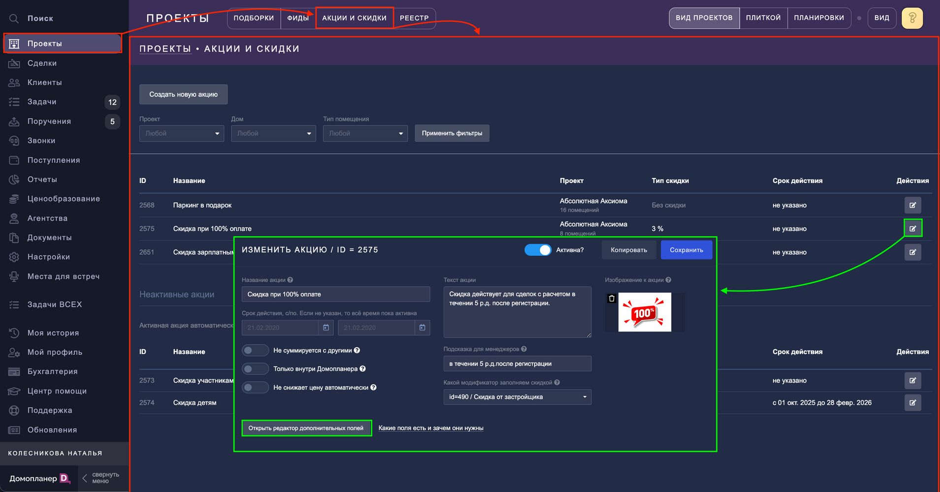 Перейдите в раздел ПРОЕКТЫ — Акции и скидки — откройте интересующую акцию — нажмите на кнопку "Открыть редактор дополнительных полей":