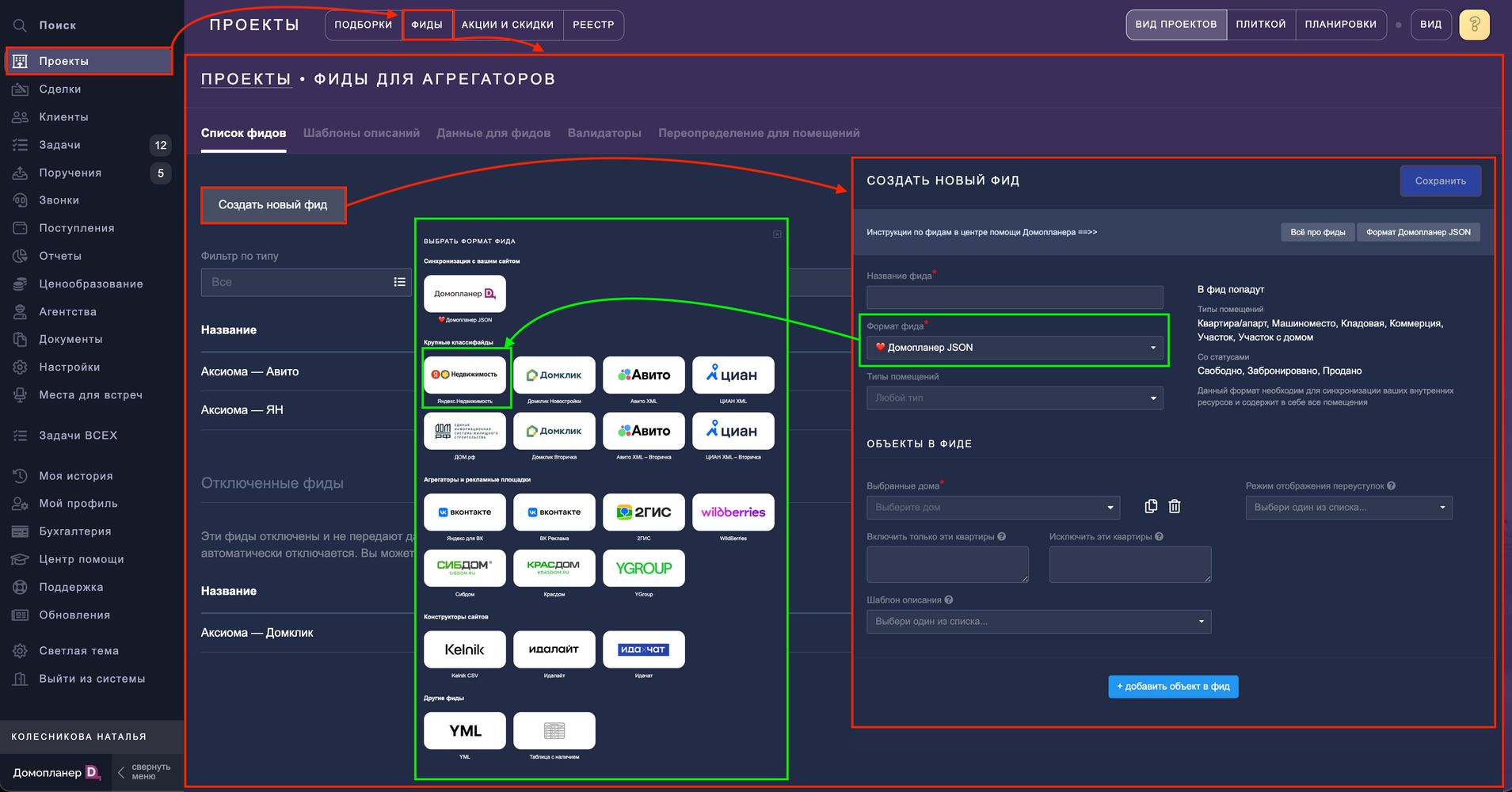 Для создания перейдите в раздел ПРОЕКТЫ — Фиды — Список фидов — нажмите кнопку "Создать фид" и выберите и выберите формат фида "Яндекс.Недвижимость":