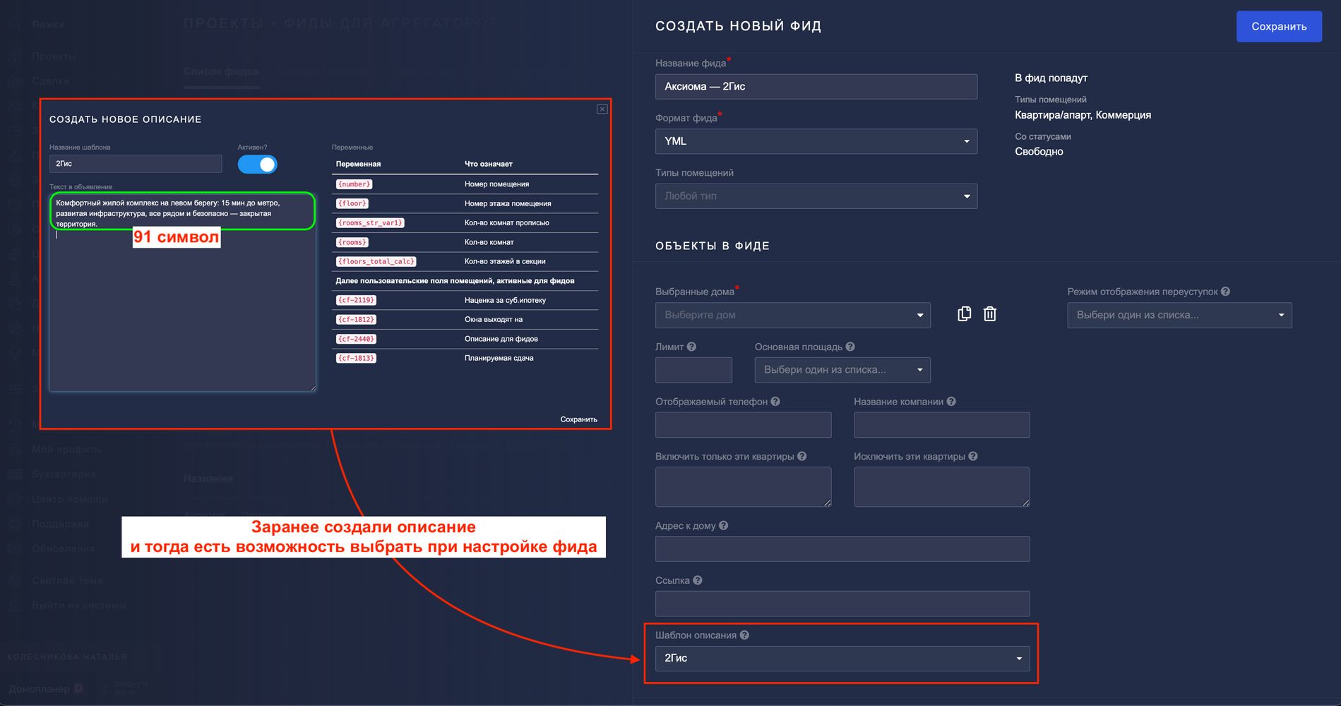 Шаблон описания для такого фида должен быть не более 100 символов, это главное требование к такому фиду. Поэтому мы рекомендуем создать отдельное описание для такого формата фида и выбирать его при настройке фида: