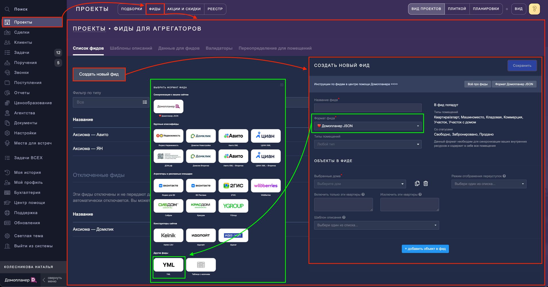 Для создания перейдите в раздел ПРОЕКТЫ — Фиды — Список фидов — нажмите кнопку "Создать фид" и и выберите формат фида "YML":