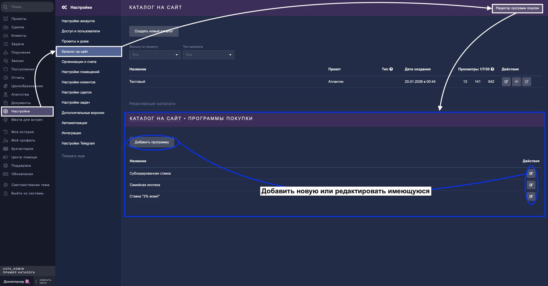 1. Перейдите в НАСТРОЙКИ — Каталог на сайт — Редактор программ покупки — добавить/редактировать: