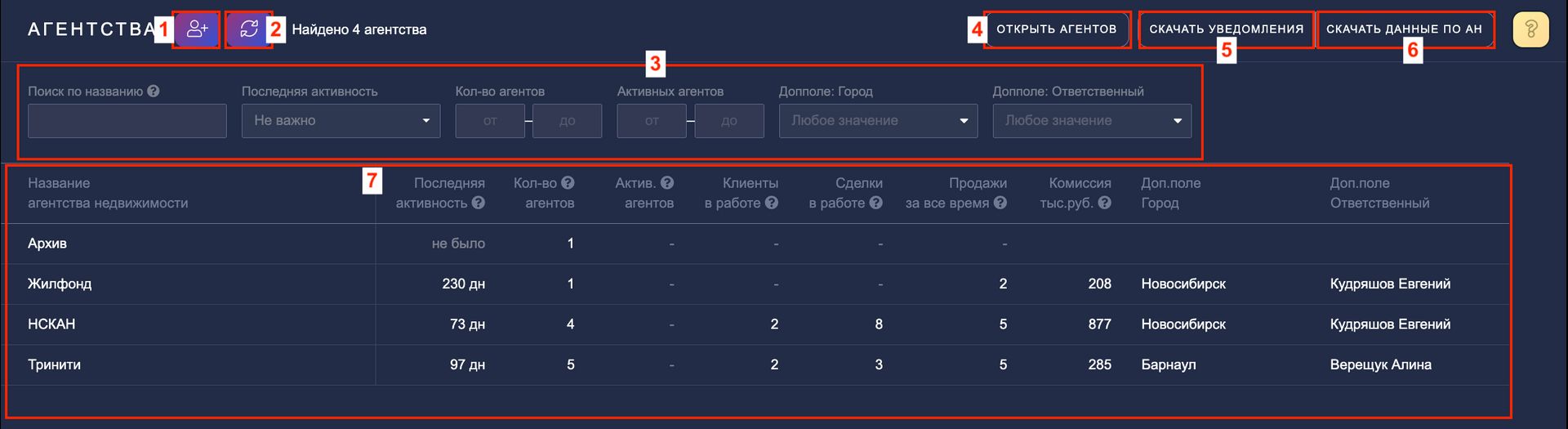 4. ОТКРЫТЬ АГЕНТОВ — открывает в новом окне список агентов, которые входят в отфильтрованные агентства. Например, отобрали партнеров по городу, нажали кнопку — и перед вами только нужные контакты для рассылки.