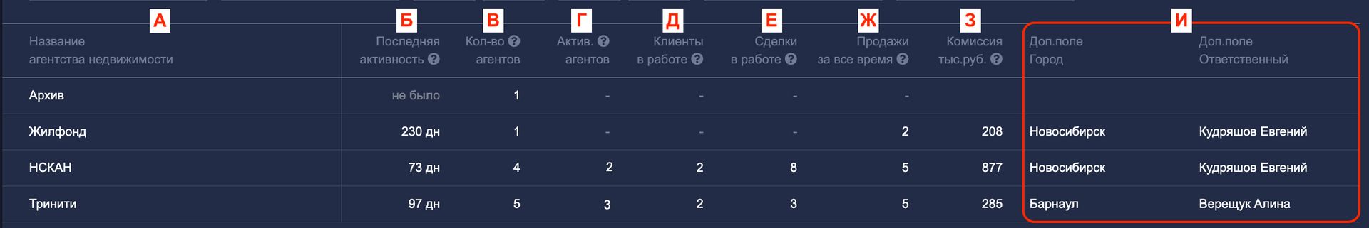 И. Дополнительные поля — это информация, которую вы сами добавили в карточки агентств: например, город, ответственный менеджер или тип сотрудничества. Настраиваются они индивидуально под каждый аккаунт. Все эти данные отображаются сразу в общей таблице — не нужно открывать карточки по отдельности. Удобно, когда нужно быстро сравнить агентства или оценить их параметры.