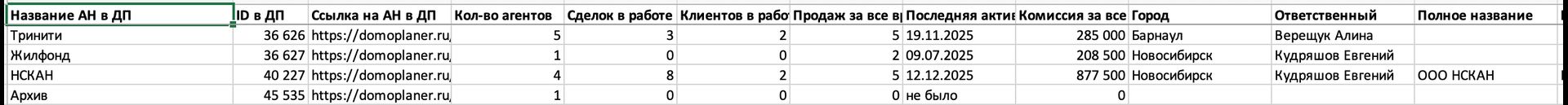 6. СКАЧАТЬ ДАННЫЕ ПО АН — сформируется и загрузится таблица данных по агентствам (банковские реквизиты, адреса, ответственные лица и т.д.) в формате Excel по всем агентствам, включая доп.поля.