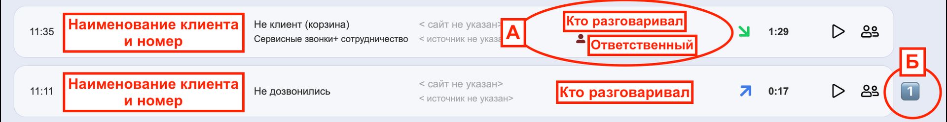 А. Если у зафиксированного клиента уже есть ответственный, но совершил/принял звонок другой сотрудник, то ниже наименования того, кто разговаривал, обозначится ответственный за клиента.